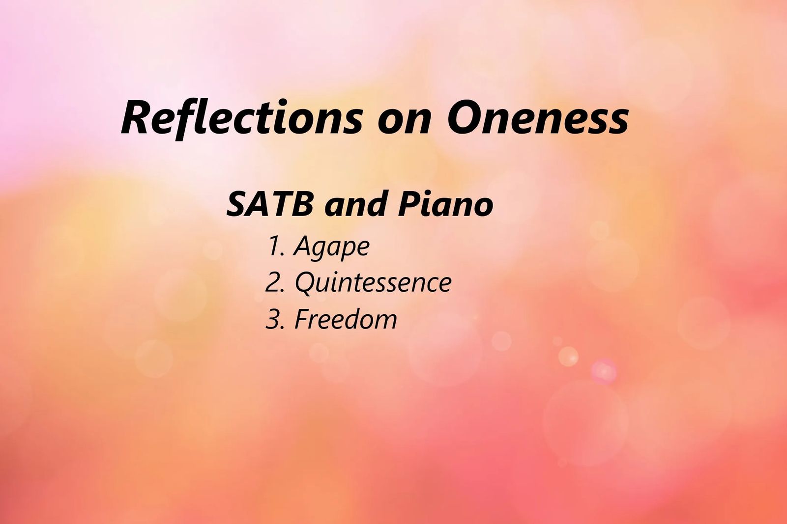 Reflections on Oneness is a three movement choral piece for SATB choir and piano. Each movement explores a different aspect of the spiritual experience of being One with each other and God. “Agape” is the Greek word for unconditional love; “Quintessence” delves into the experience of the expansion of being one with the Universe; “Freedom” is about the elation that comes from connecting to God.