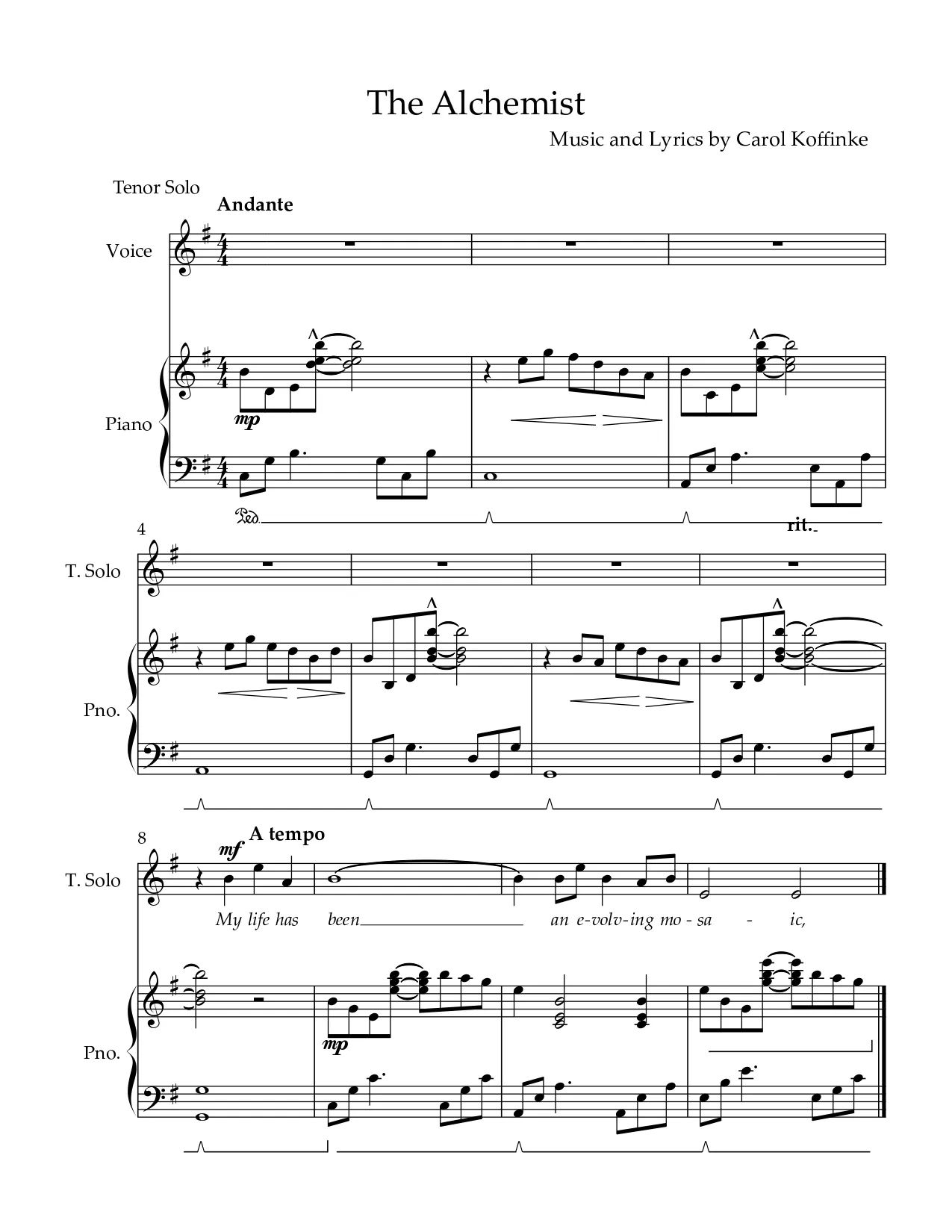 Original text by Carol Koffinke. This is an art song about meeting the love of your life and realizing that every moment of your life was designed to bring you together. The song uses the analogy of a mosaic to illustrate that epiphany where the mosaic’s tiny pieces of glass suddenly explode with pure joy upon that first kiss and are transformed into a brilliant, sparkling jewels as they realize they have fulfilled their destiny…to bring the two together.